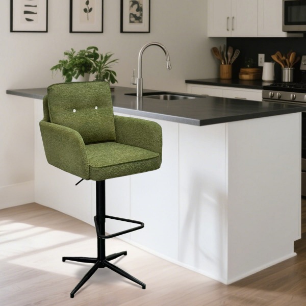 Sgabello da bar girevole regolabile in tessuto verde moderno con auto-ritorno e base in metallo