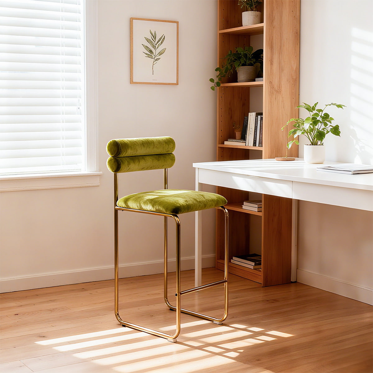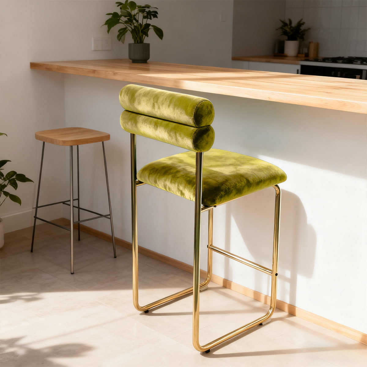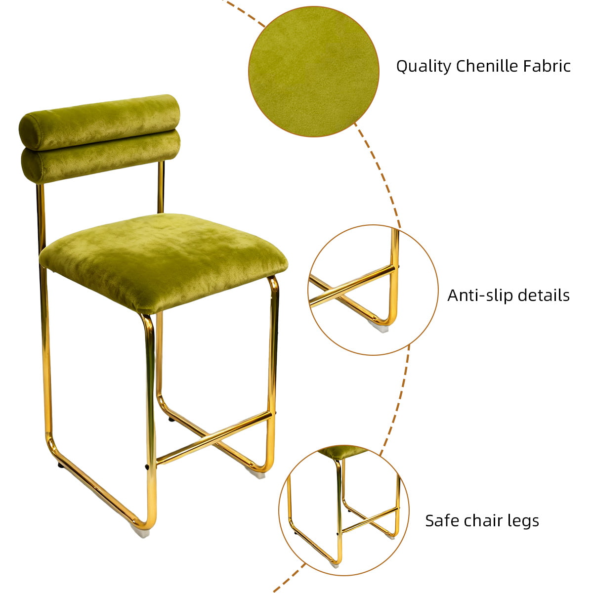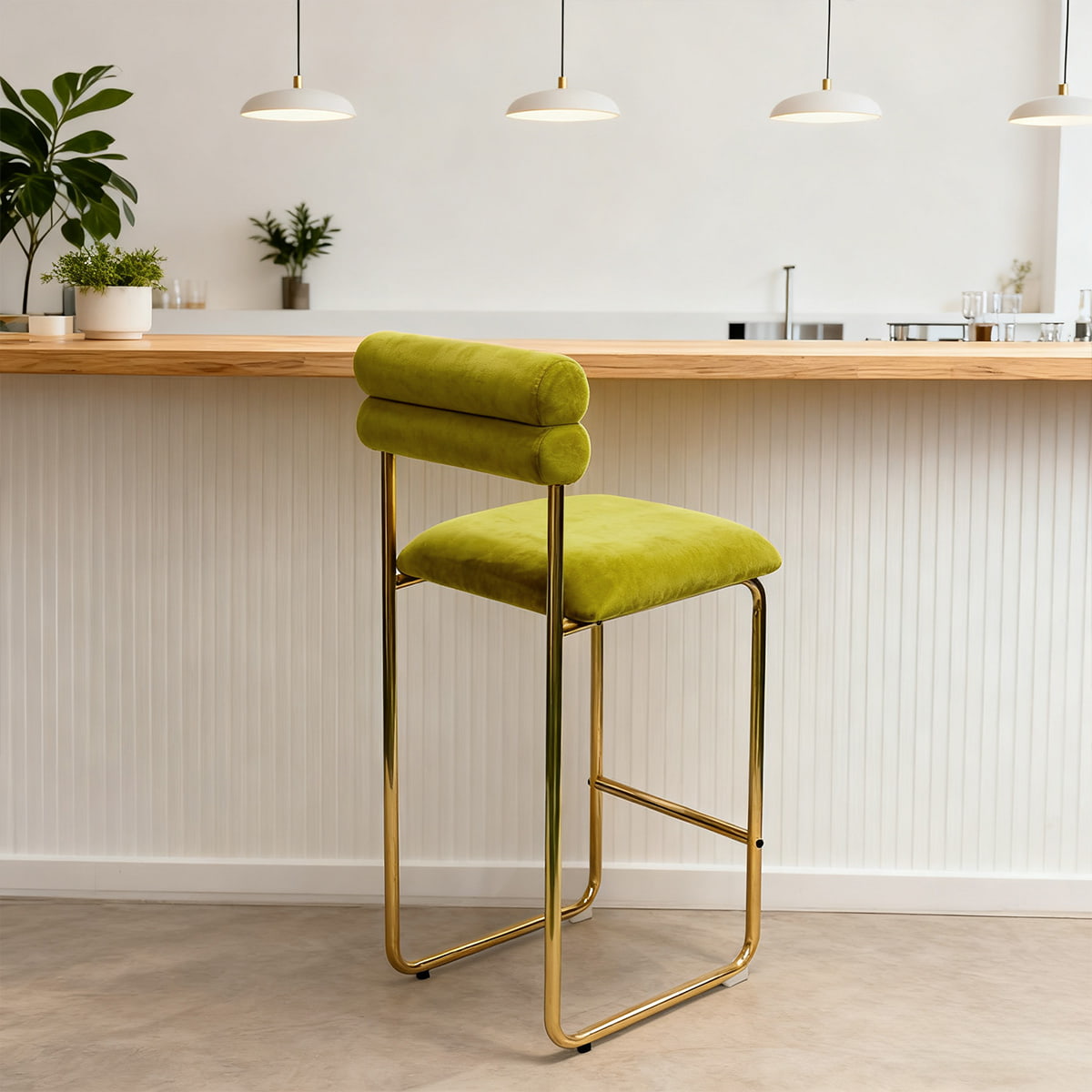 La sua altezza di 37,4 pollici si adatta ai banconi della cucina e ai bar da pranzo standard, mentre il sedile da 25,9 pollici garantisce un comfort ottimale per lunghe conversazioni o cene informali. Il morbido rivestimento in velluto offre un'esperienza tattile lussuosa e le gambe placcate oro aggiungono un tocco raffinato. Con un cuscino in schiuma ad alta resilienza e una base antiscivolo, questo sgabello è progettato per combinare comfort, stile e durata, perfetto sia per gli spazi domestici che commerciali.