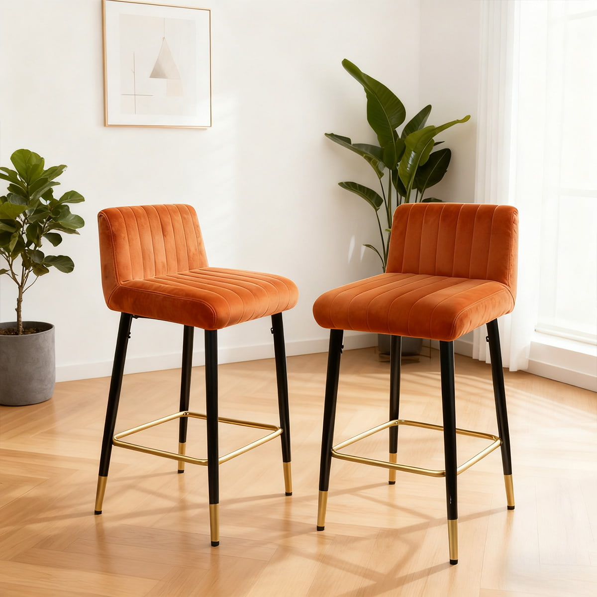 Sgabello da bar moderno in velluto arancione ocra - Sedia girevole a 360° con altezza del bancone con gambe in metallo nero e oro, sedile imbottito morbido e poggiapiedi per isola cucina, bar o sala da pranzo