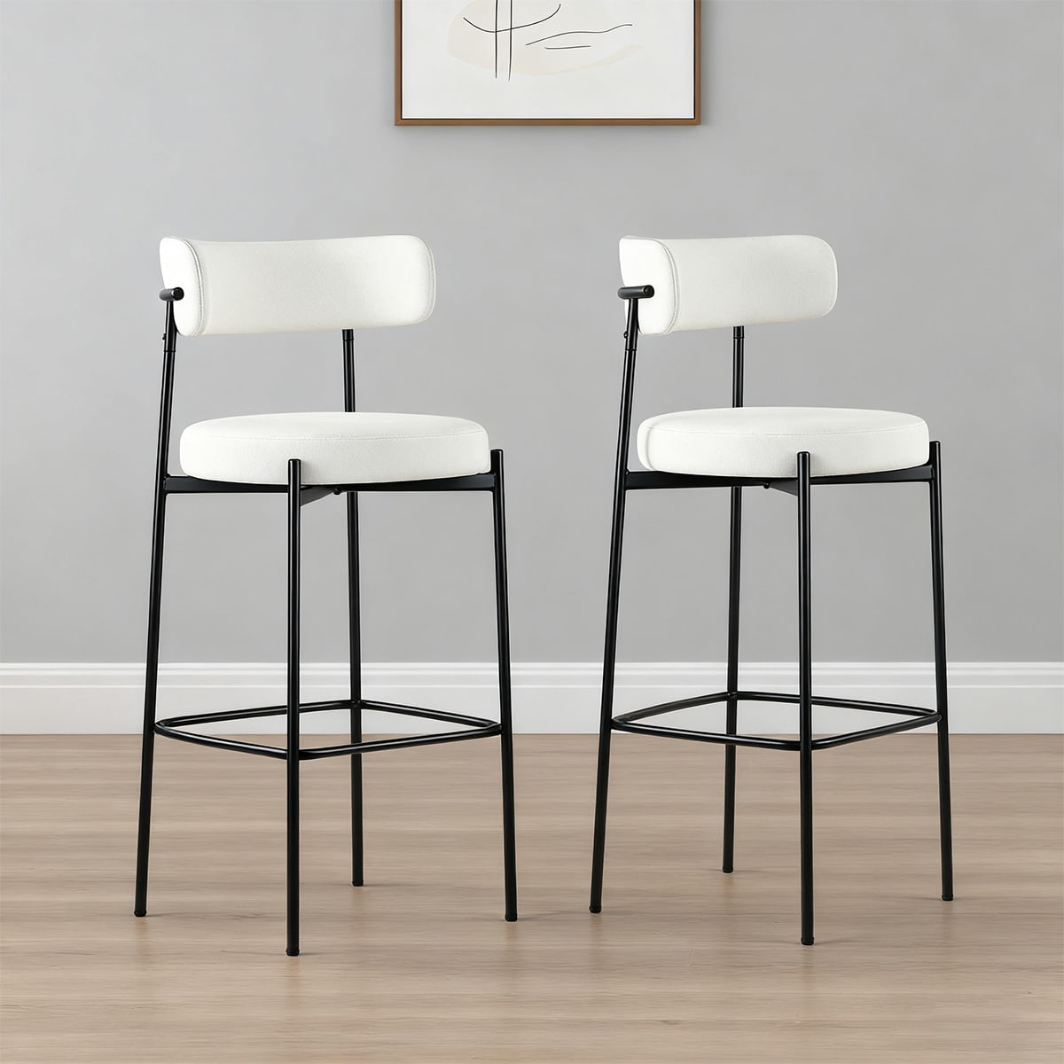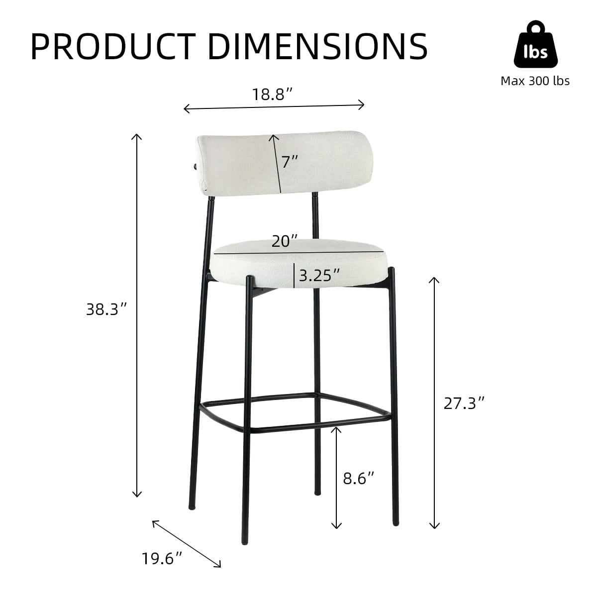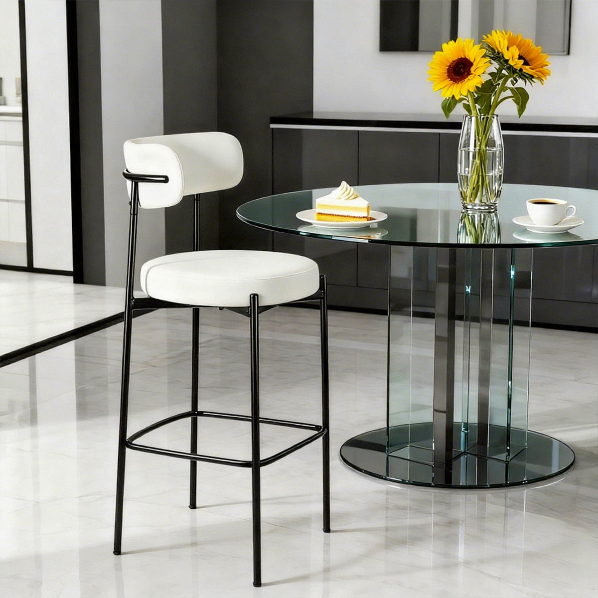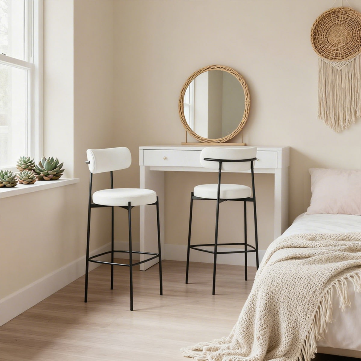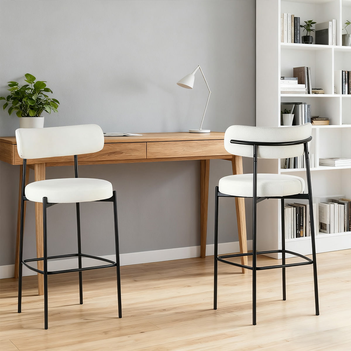 I nostri sgabelli da bancone bouclé bianchi sono progettati per offrire comfort e stile, dotati di resistente struttura in metallo nero, sedili in schiuma ad alta densità e schienali ergonomici: ideali per banconi di cucina, bar, ristoranti e hotel.