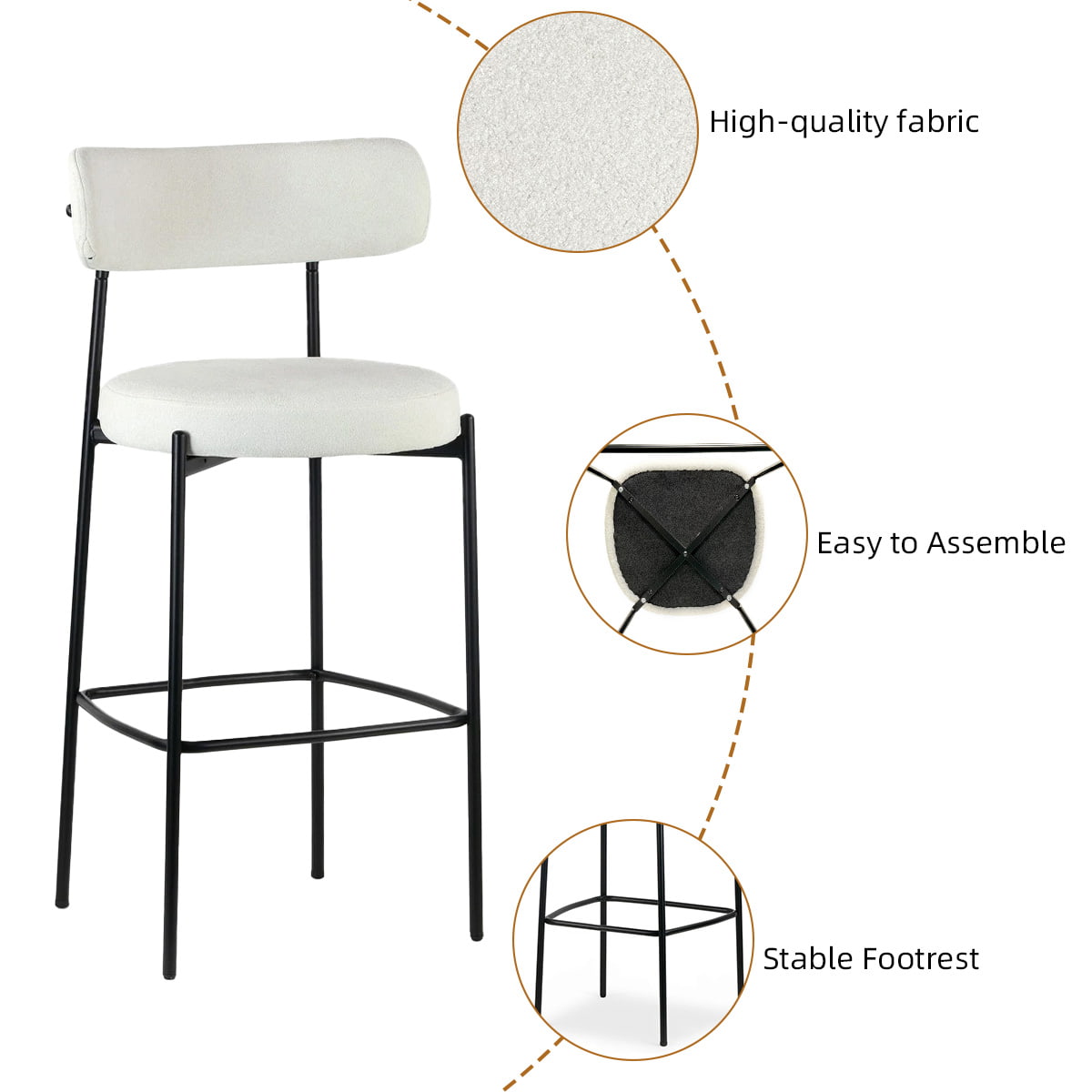 Sgabello da bar moderno in bouclé bianco con gambe in metallo nero - Sedie da bar imbottite ad altezza bancone con schienale e poggiapiedi per isola cucina, sala da pranzo e bar di casa