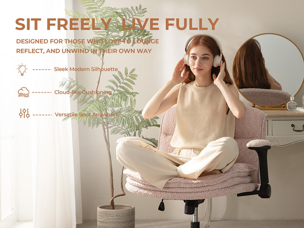 I braccioli ribaltabili massimizzano la flessibilità: siediti a gambe incrociate, lateralmente, rannicchiato o in posizione verticale con facilità. Questa sedia è costruita per offrire comfort, movimento e stile, perfettamente adatta per uffici domestici, camere da letto e spazi creativi.