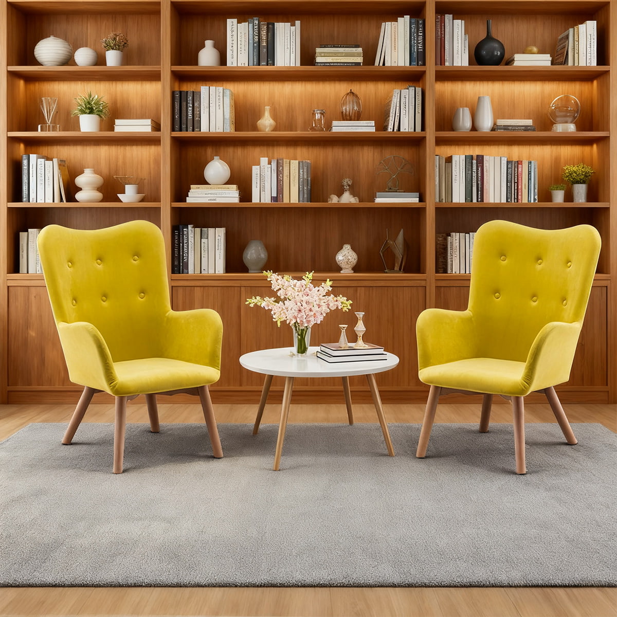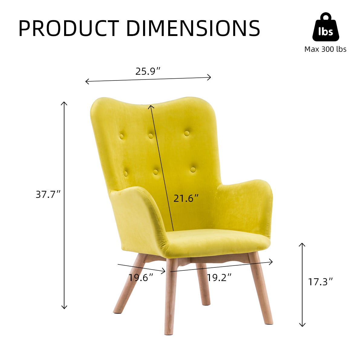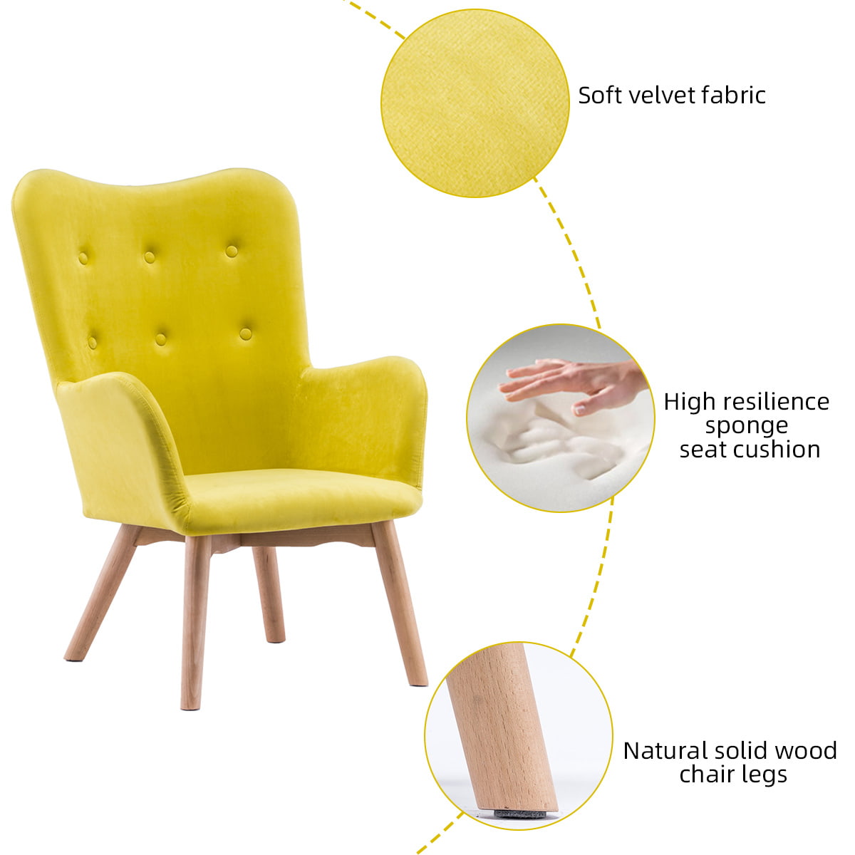 Poltrona moderna con accenti in velluto giallo - Sedia per il tempo libero capitonné con schienale alare con gambe e braccioli in legno per soggiorno, camera da letto o ufficio